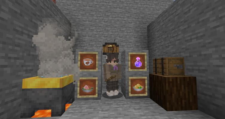 The Tavern-Brewer is your innkeep and general consumable profession. They create potent potions with mutliple effects without needing nether materials, and alcoholic beverages for everyone to enjoy. It's also important to note they're well versed in cooking being able to create food with higher sat levels, and even give effects at higher tiers. This profession uses a potion discovery system where you'll have to discover what ingredients cause what effects in your cauldron to make certain effects.